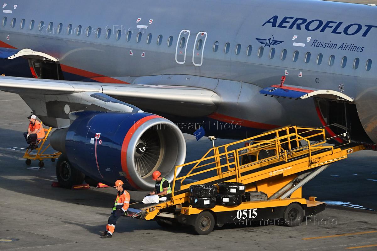 Genre photography. Aeroflot airline plane at Sheremetyevo International Airport named after A.S. Pushkin. Airport workers unloading luggage from an airplane.