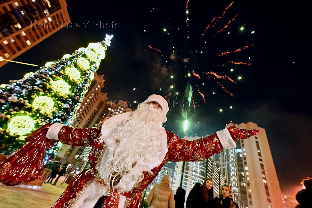 Celebrating the New Year in Moscow. Genre photography. Decorative figure of Father Frost in the courtyard of a residential building.