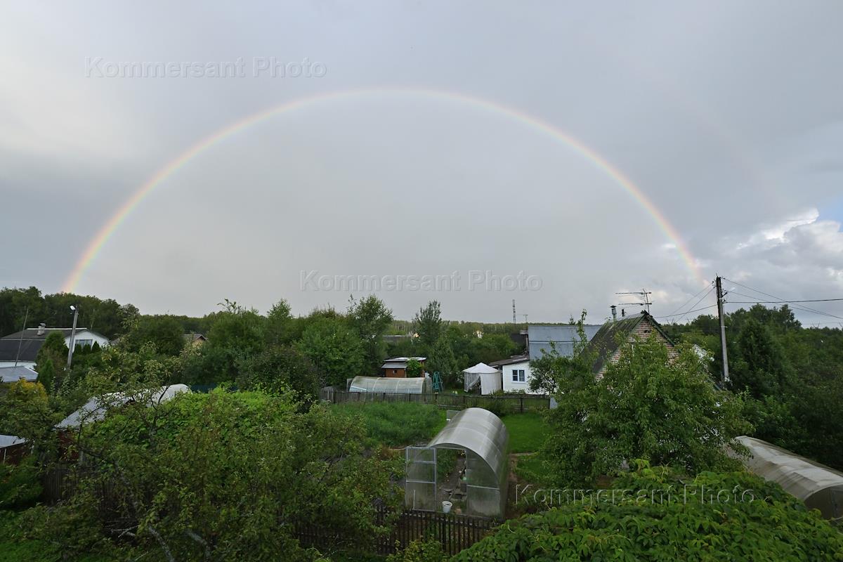 Жанровая фотография. Радуга в небе над дачным поселком.