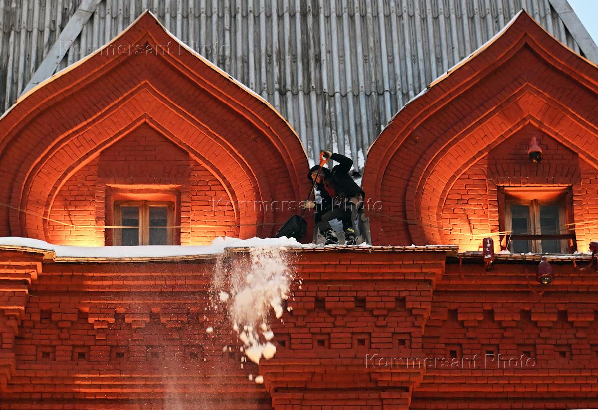 Genre photography. Workers dismantling the stage structure in Red Square.