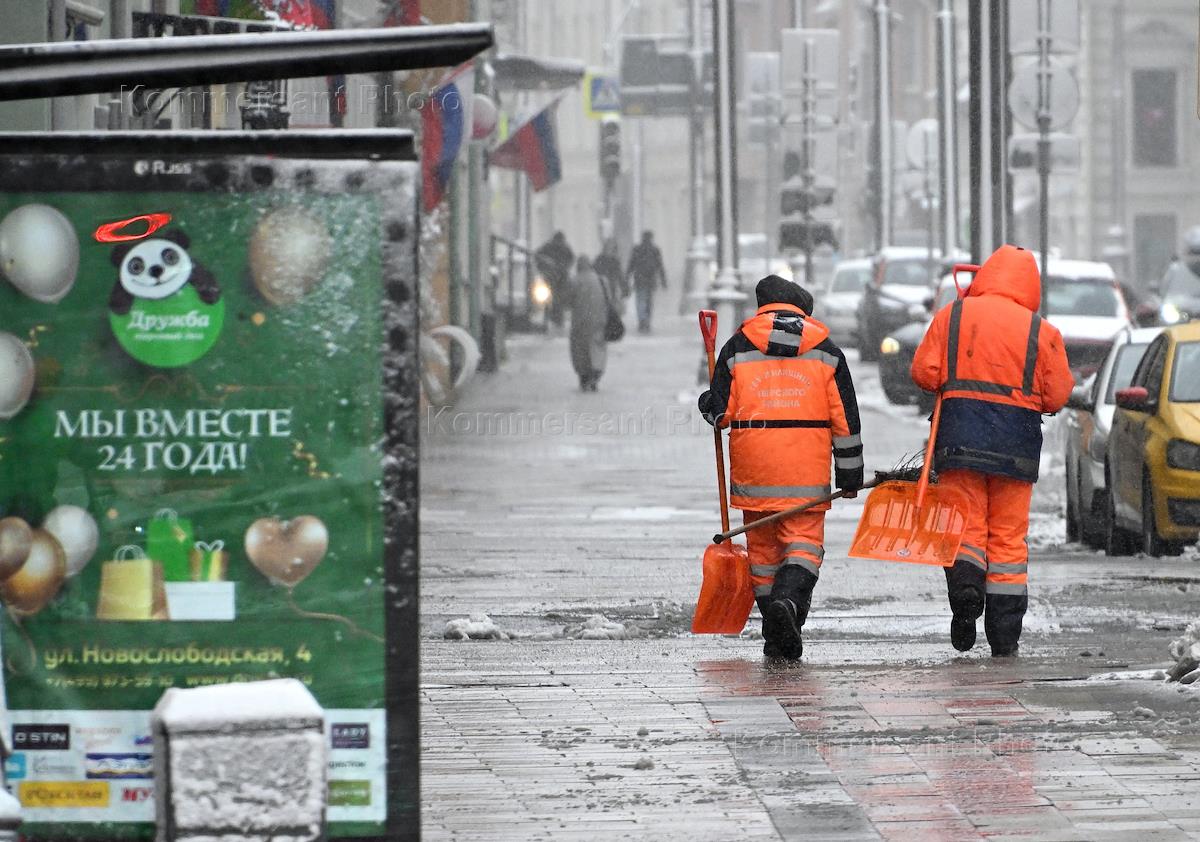 Genre photography. Preparing for the New Year celebration. An employee of the GUM Skating Rink on Red Square at the entrance to visitors. Installation with the inscription "30+".