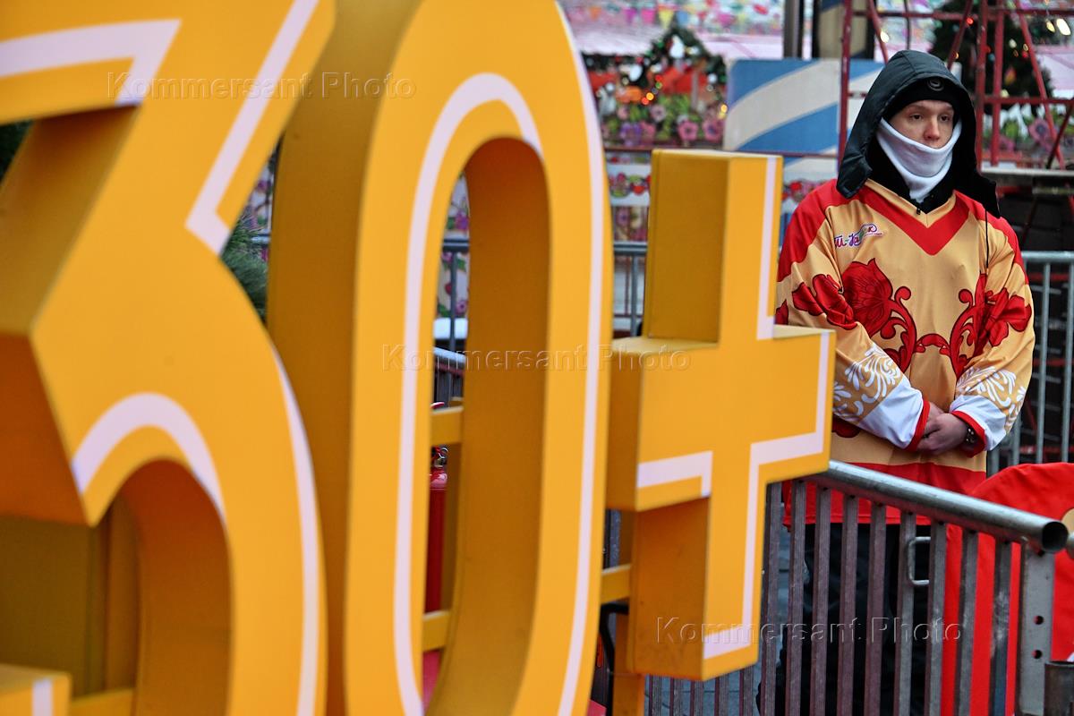 Жанровая фотография. Подготовка к празднованию Нового года. Сотрудник "ГУМ Каток" на Красной площади на пропуске посетителей. Инсталляция с надписью "30+".