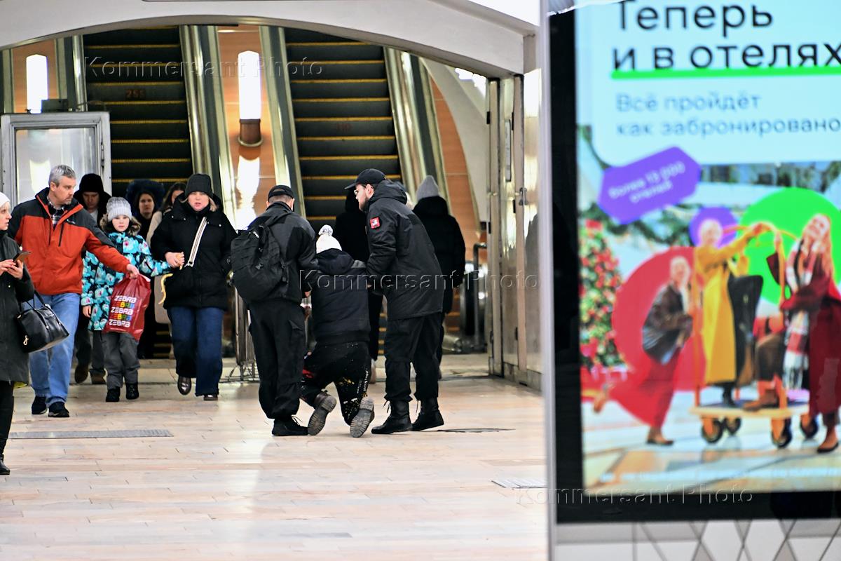 Genre photography. Metro police officers get a drunken passenger out of the station.