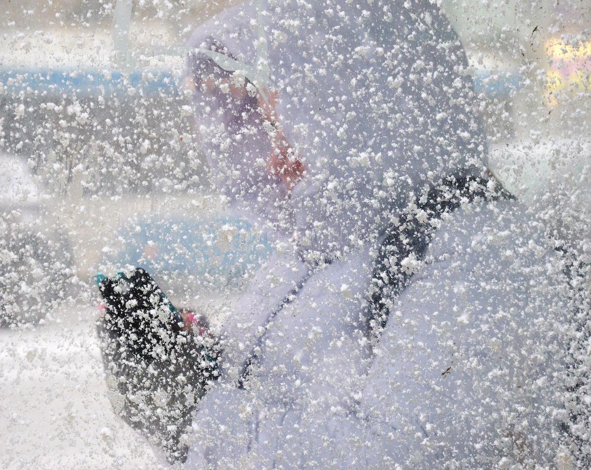 Виды Санкт-Петербурга во время снегопада. Жанровая фотография. Женщина с мобильным телефоном на остановке общественного транспорта.