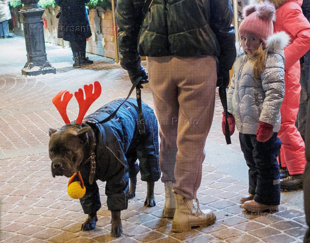 Виды Санкт-Петербурга. Жанровая фотография. Собака в новогоднем костюме во время прогулки.