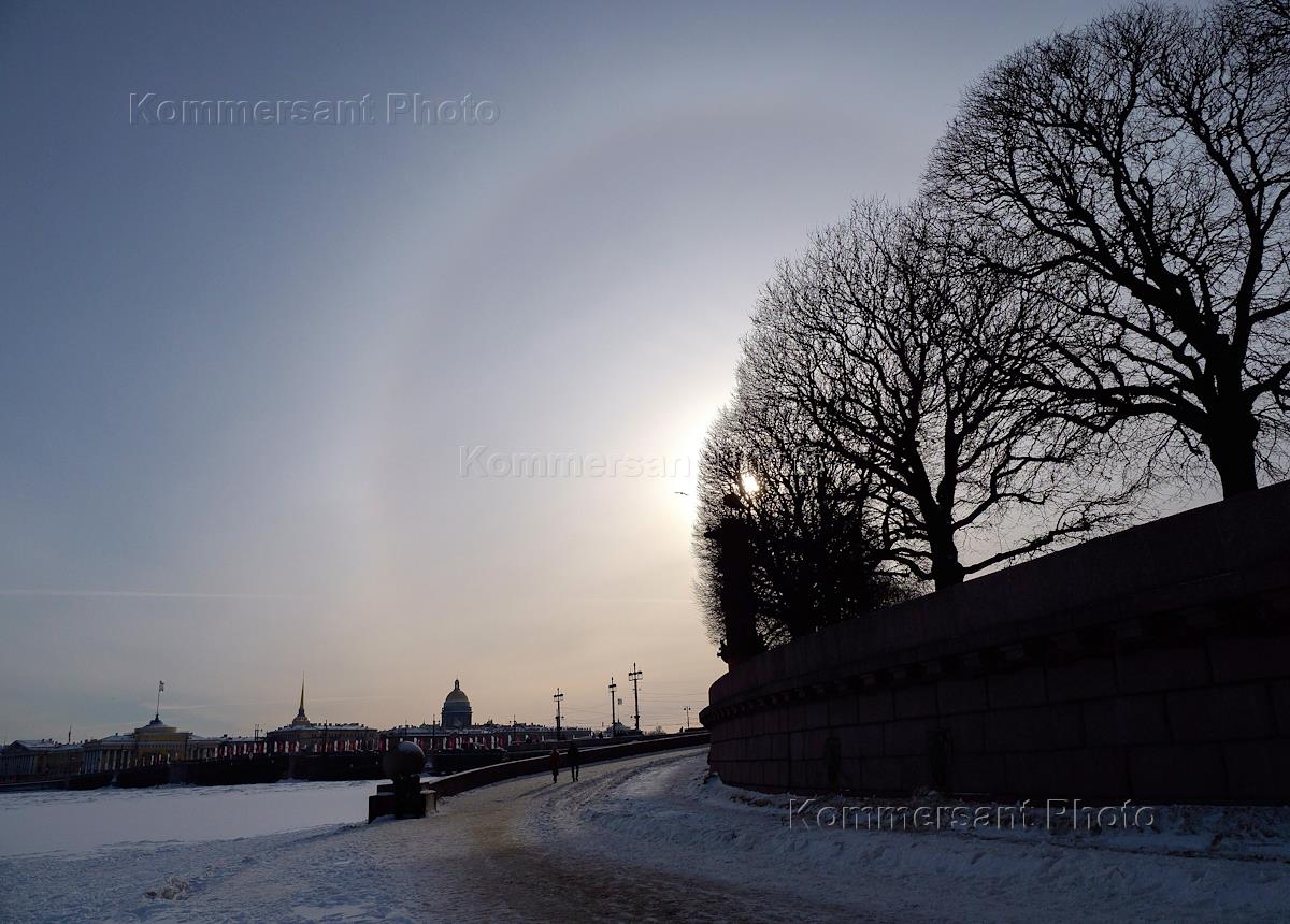 Жанровая фотография. Виды Санкт-Петербурга. Люди гуляют по льду реки Невы в центре города.