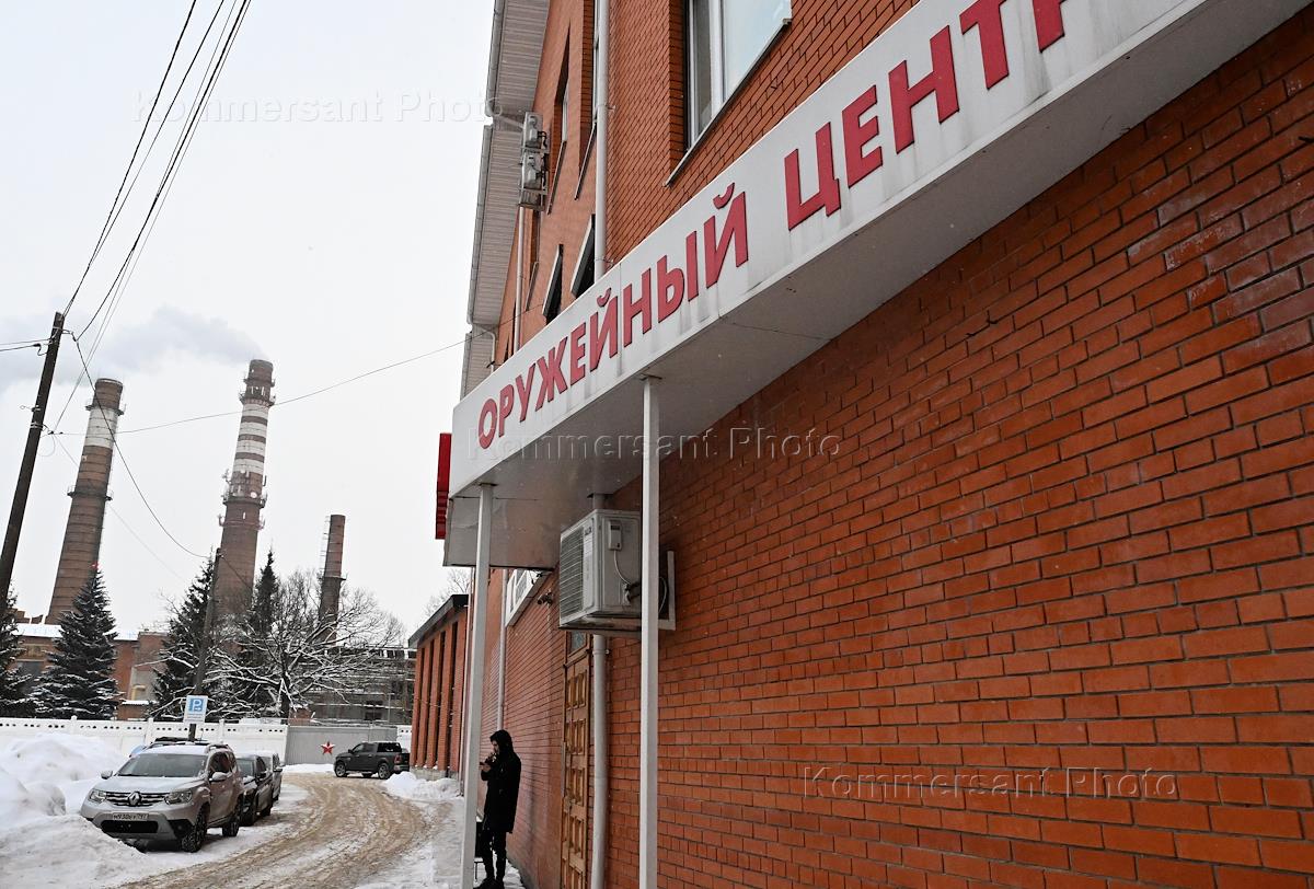 Климовский специализированный патронный завод (ЗАО "КСПЗ"). Жанровая фотография. Вывеска "Темп" оружейный центр на здании.