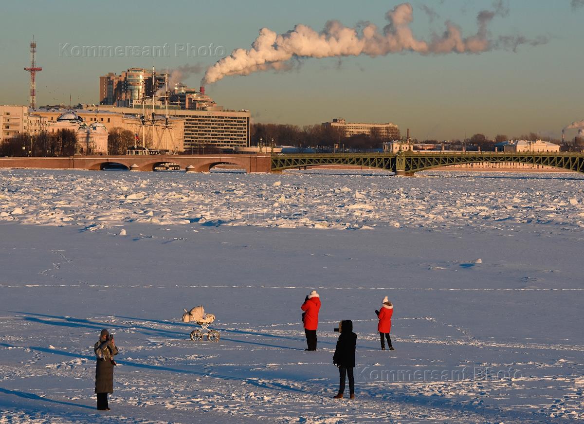 Виды Санкт-Петербурга. Жанровая фотография. Люди гуляют по льду реки Невы.