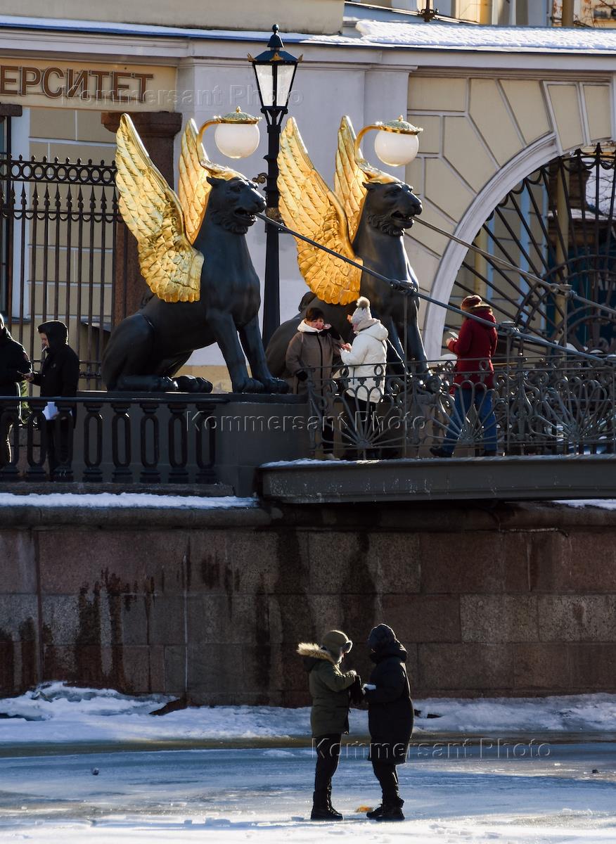 Виды Санкт-Петербурга. Жанровая фотография. Дети играют на льду канала Грибоедова у Банковского моста.