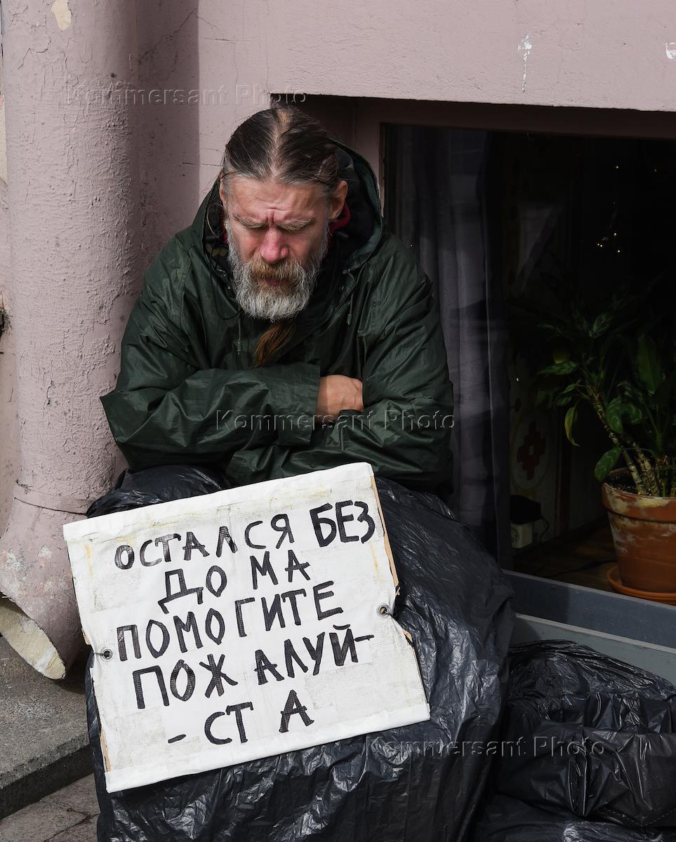Виды Санкт-Петербурга. Жанровая фотография. Мужчина с табличкой "Остался без дома, помогите, пожалуйста" на Невском проспекте.