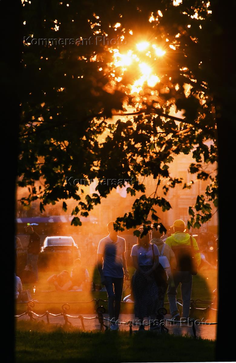Виды Санкт-Петербурга. Жанровая фотография. Прохожие в лучах закатного солнца на Сенатской площади.