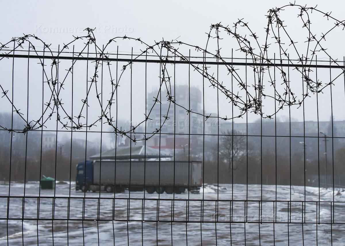 Виды Ивангорода. Жанровая фотография. Грузовая фура за металлическим забором с колючей проволокой.