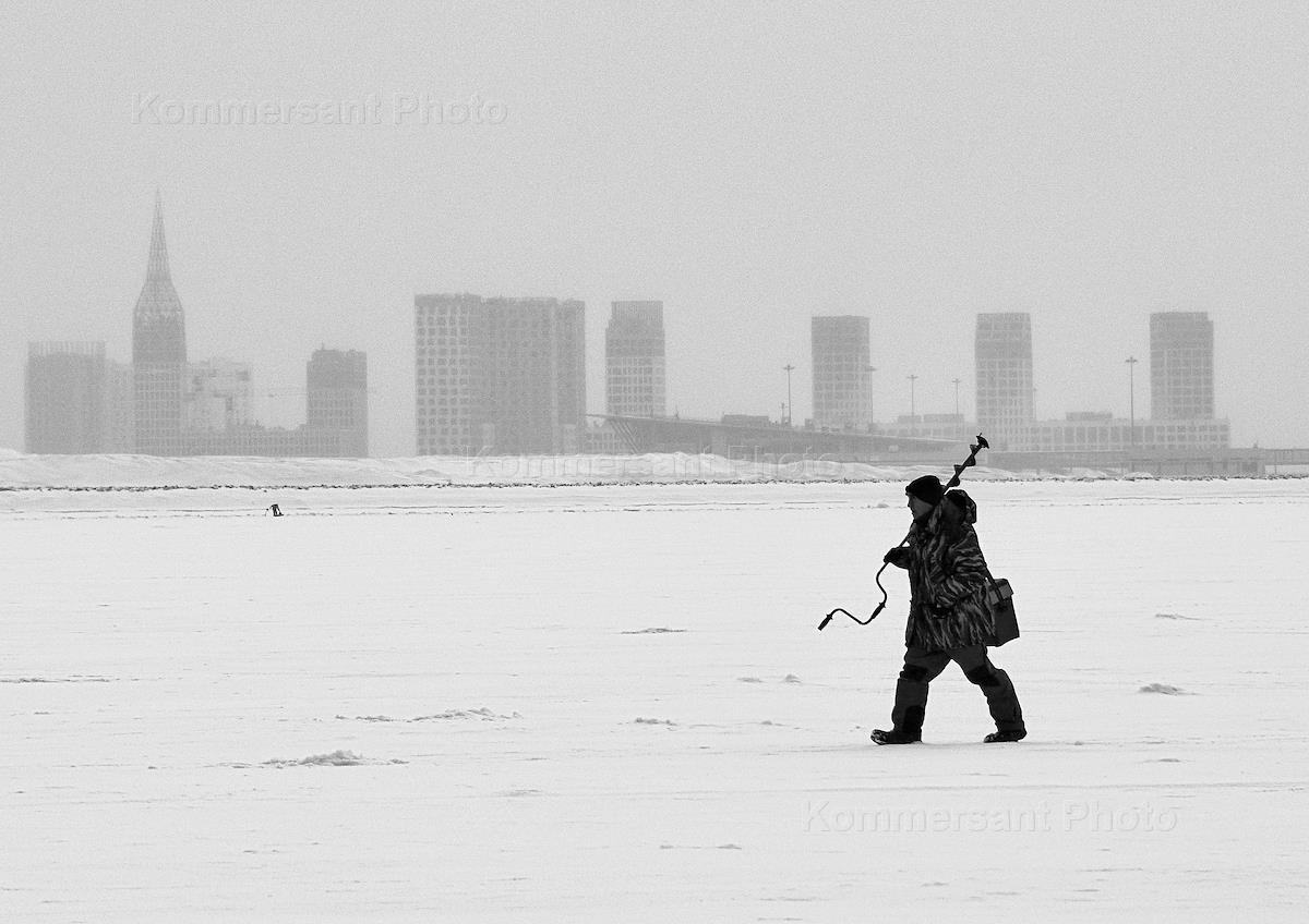 Виды Санкт-Петербурга. Жанровая фотография. Рыбак идет по льду залива на фоне зданий на намыве Васильевского острова.