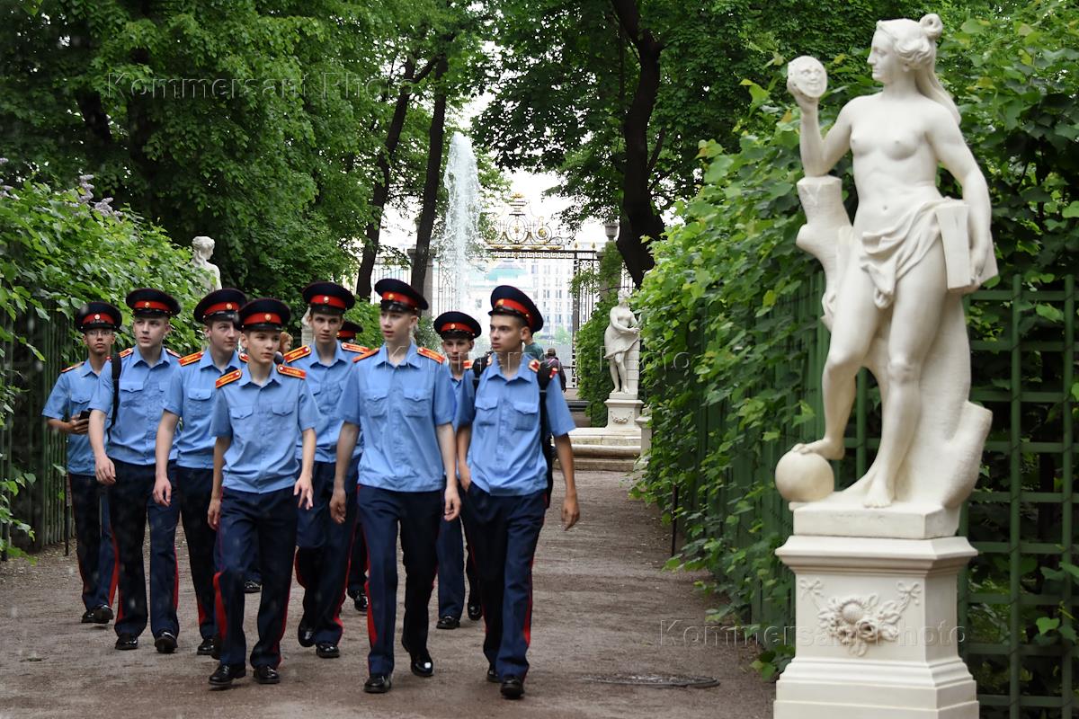 Виды Санкт-Петербурга. Жанровая фотография. Группа курсантов в Летнем саду.