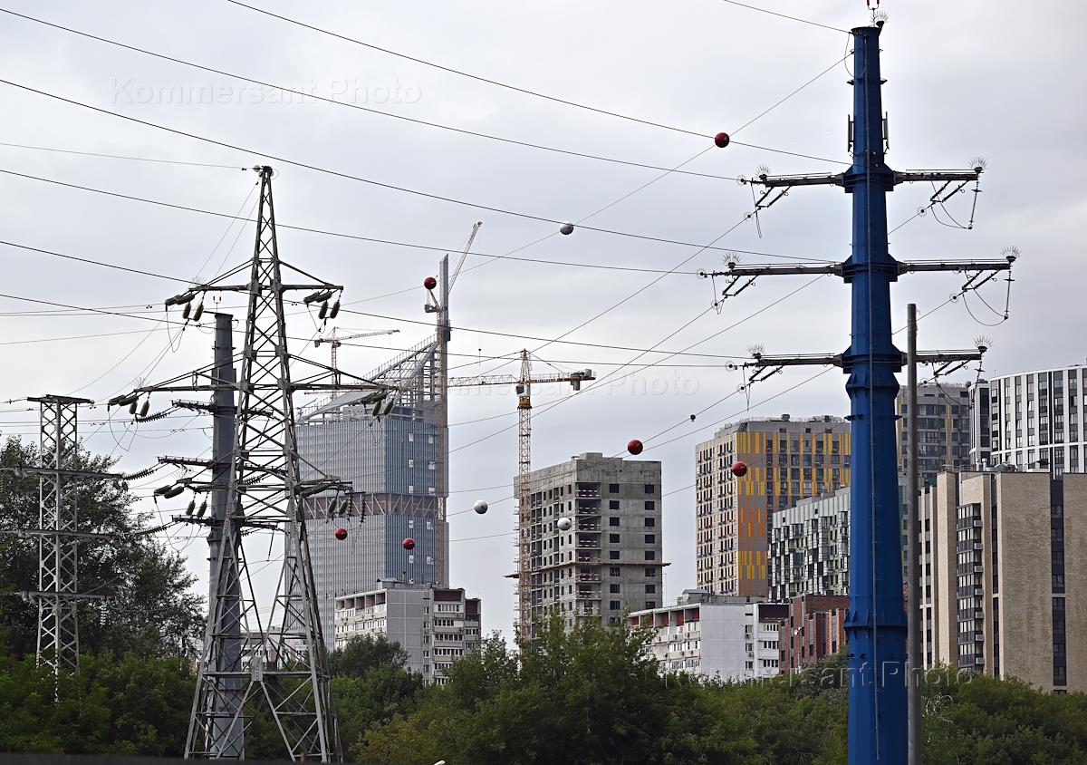 Виды Москвы. Жанровая фотография. Опоры линии электропередачи на фоне многоэтажной новой застройки.
