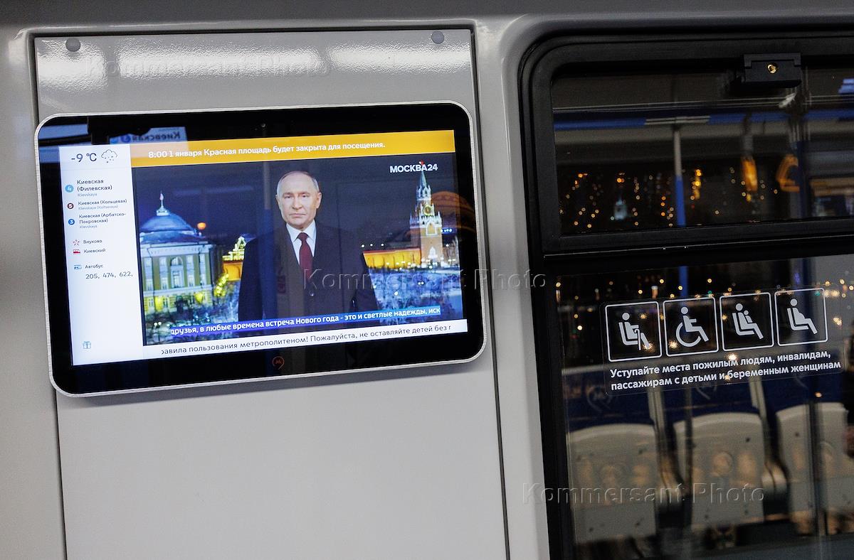 Genre photography. Broadcast of New Year's greetings from Russian President Vladimir Putin on the screen in a subway car.