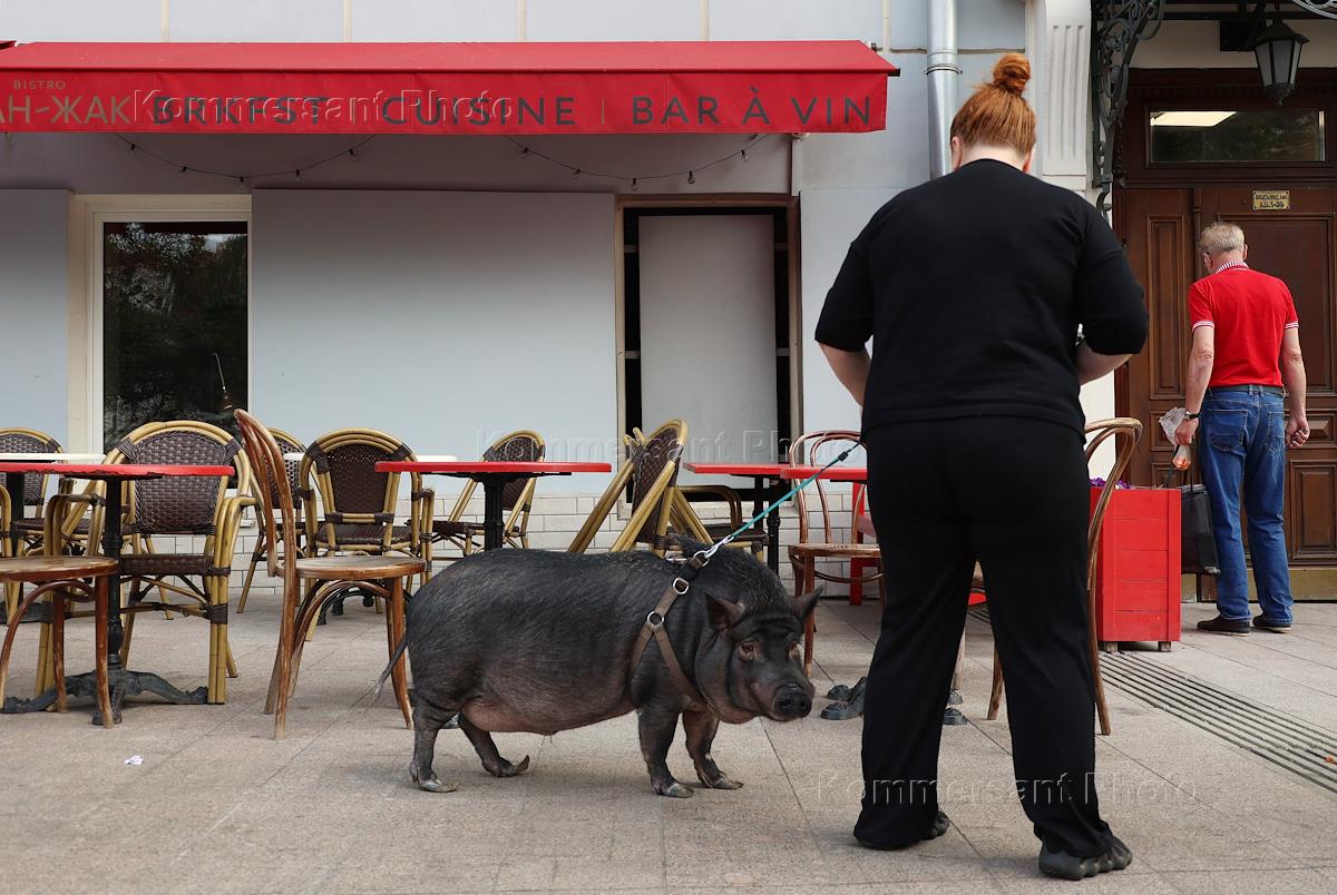 Жанровая фотография. Женщина с домашним мини-пигом на улице рядом с уличным кафе.