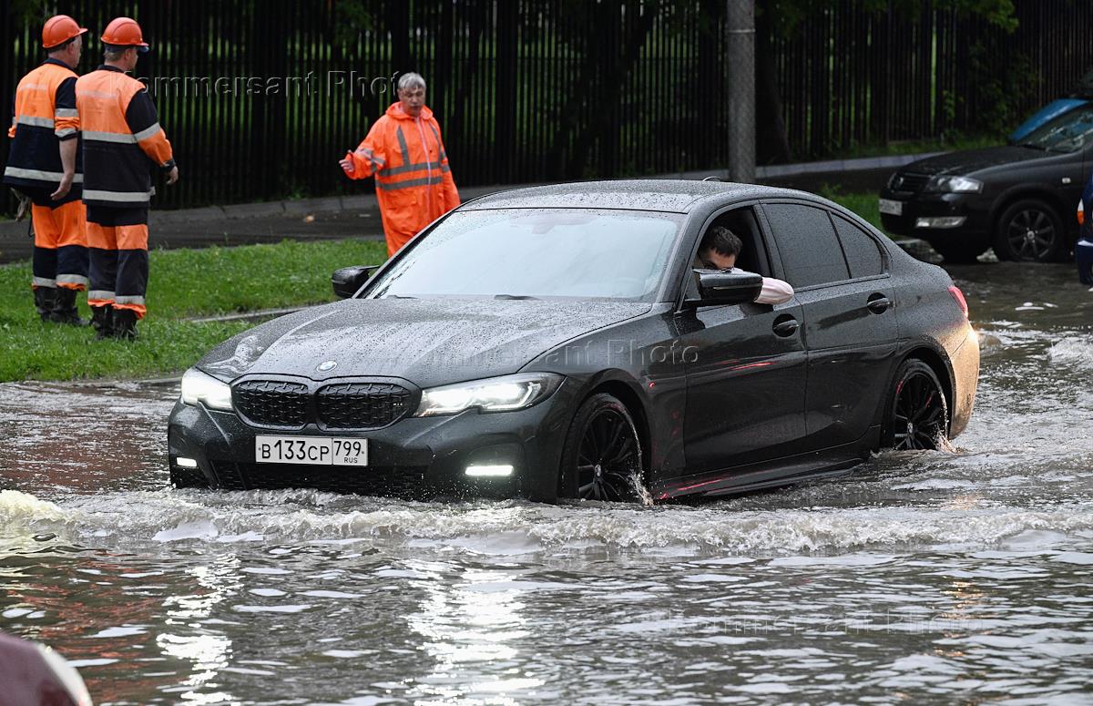 Жанровая фотография. Сильный дождь в городе. Автомобили едут по затопленной улице во время дождя. Сотрудники Мосводоканала во время работ по откачки воды.