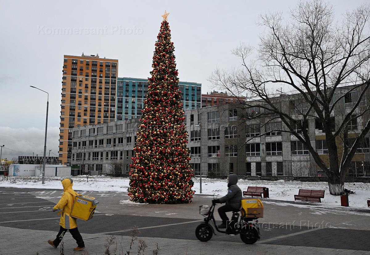 Жанровая фотография. Многоэтажный жилой комплекс. Украшенная новогодняя елка.