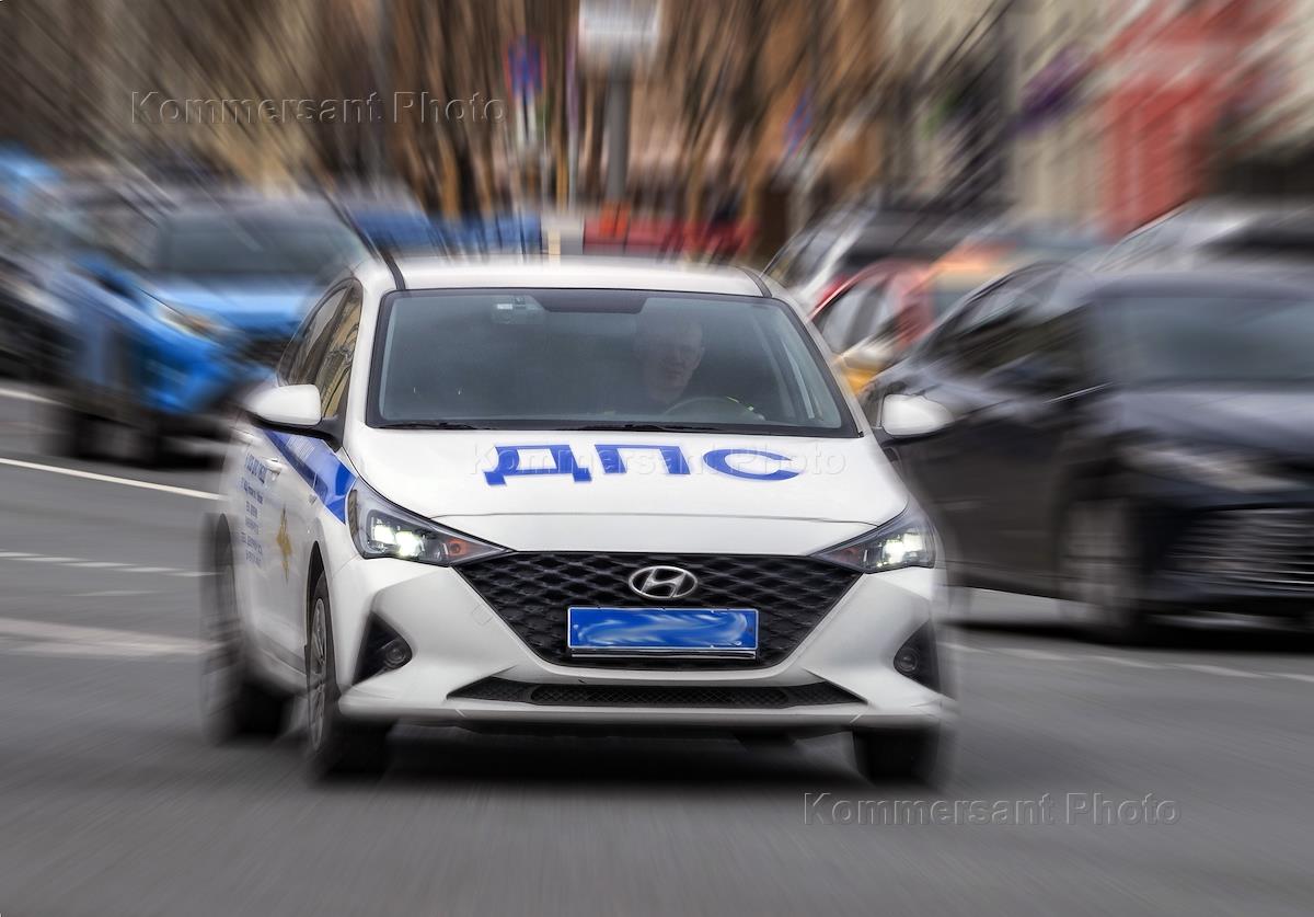 Genre photography. A police traffic police car while driving along a city street.