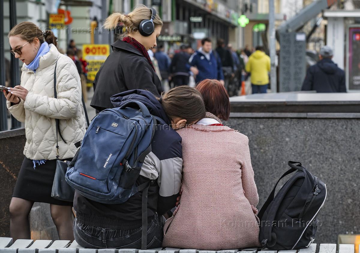 Виды Москвы. Жанровая фотография. Парень и девушка с мобильным телефоном.