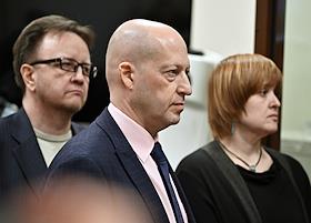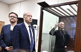 Избрание меры пресечения лидеру движения "Левый фронт" Сергею Удальцову, обвиняемому по делу об оправдании терроризма в интернете, в Басманном районном суде. Адвокаты Дмитрий Аграновский (в центре) и Виолетта Волкова (справа) во время заседания.