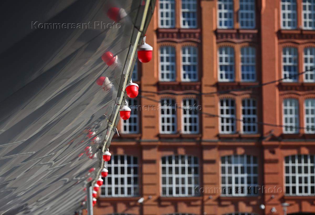 Views of Moscow. Genre photography. Daily life on the city streets. Installation of a canopy for the summer veranda of a restaurant.