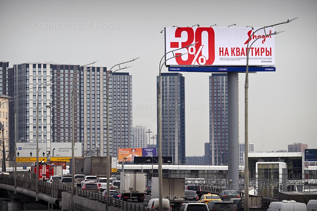 Genre photography. Advertising stand on the city highway. The inscription on the stand "Minus 30 percent on apartments"
