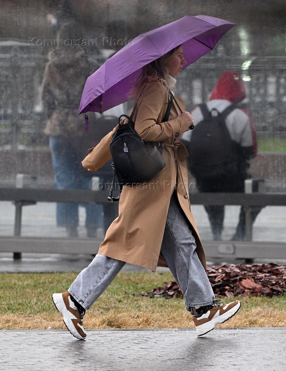 Snowfall in Moscow. Genre photography. Passers-by without an umbrella on the street during a snowfall.