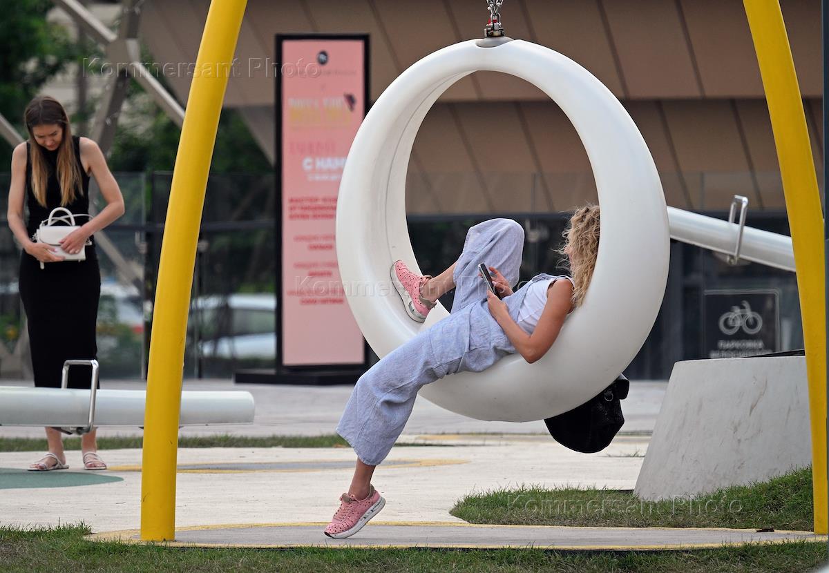 Жанровая фотография. Девушка катается на качелях в парке на площади у Павелецкого вокзала.