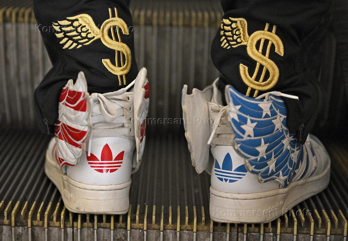 Жанровая фотография. Мужчина в брюках с принтом в виде знака доллара с крылышками и кроссовках adidas на эскалаторе станции Московского метрополитена.