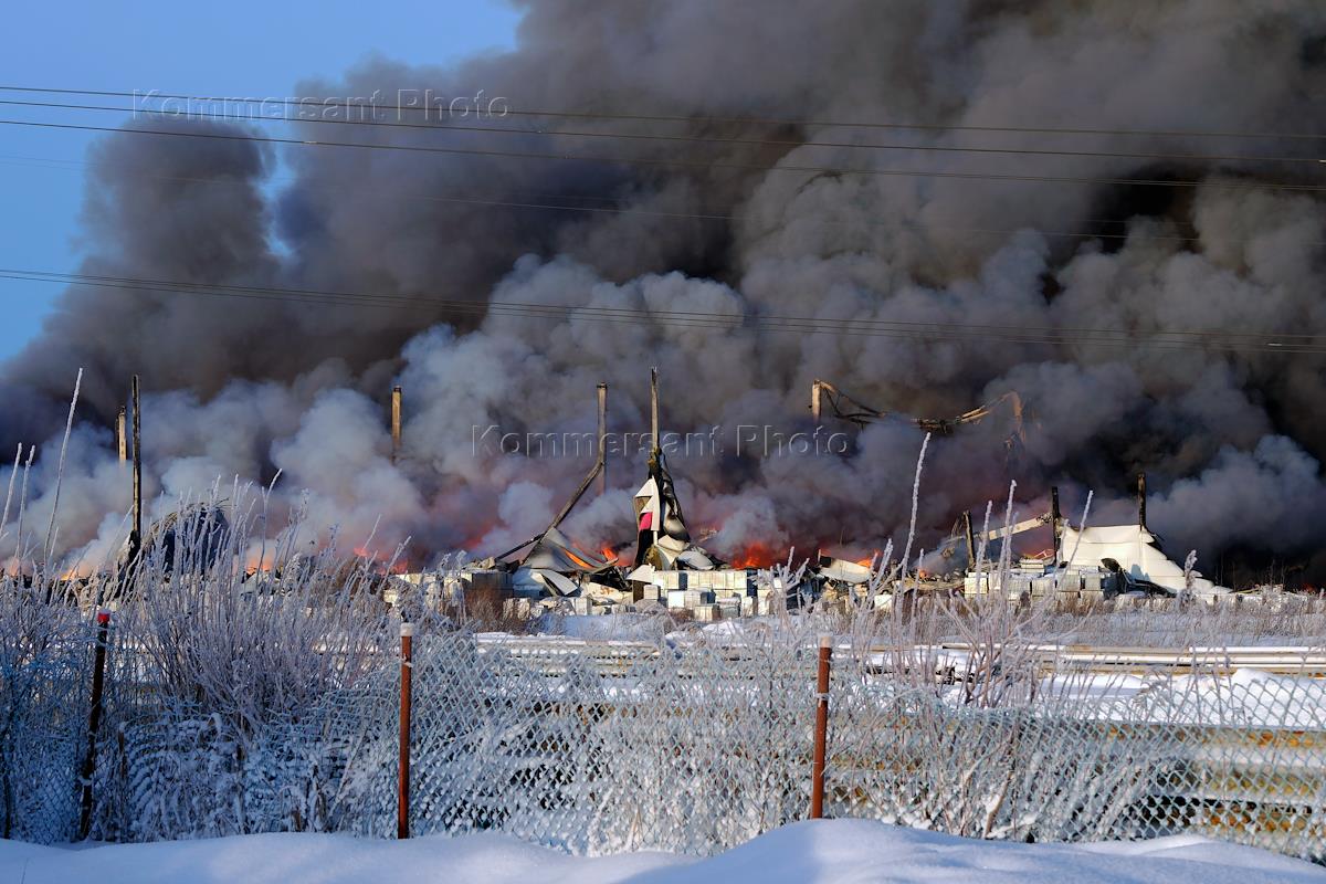 Пожар на складе компании Wildberries в поселке Шушары на Московском шоссе, дом 153, корп. 2. Жанровая фотография. Дым от пожара в небе и сгоревшего здание склада.