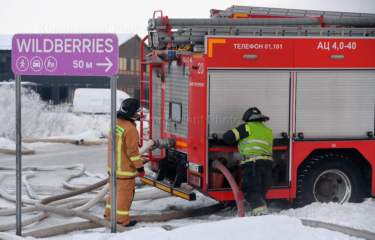 Пожар на складе компании Wildberries в поселке Шушары на Московском шоссе, дом 153, корп. 2. Жанровая фотография. Сотрудники пожарной службы МЧС России на месте пожара.