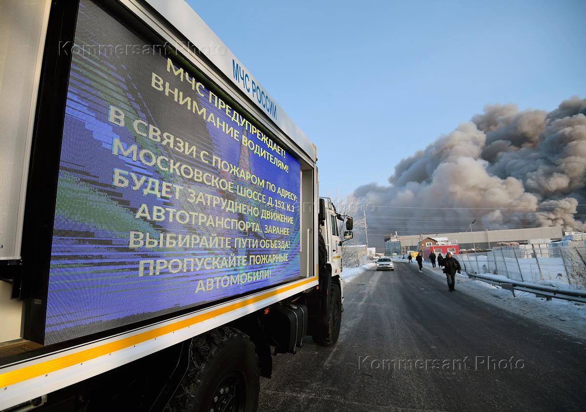 Пожар на складе компании Wildberries в поселке Шушары на Московском шоссе, дом 153, корп. 2. Жанровая фотография. Дым от пожара в небе над зданием склада. Объявление МЧС России на борту автомобиля о затруднении движения по Московскому шоссе.