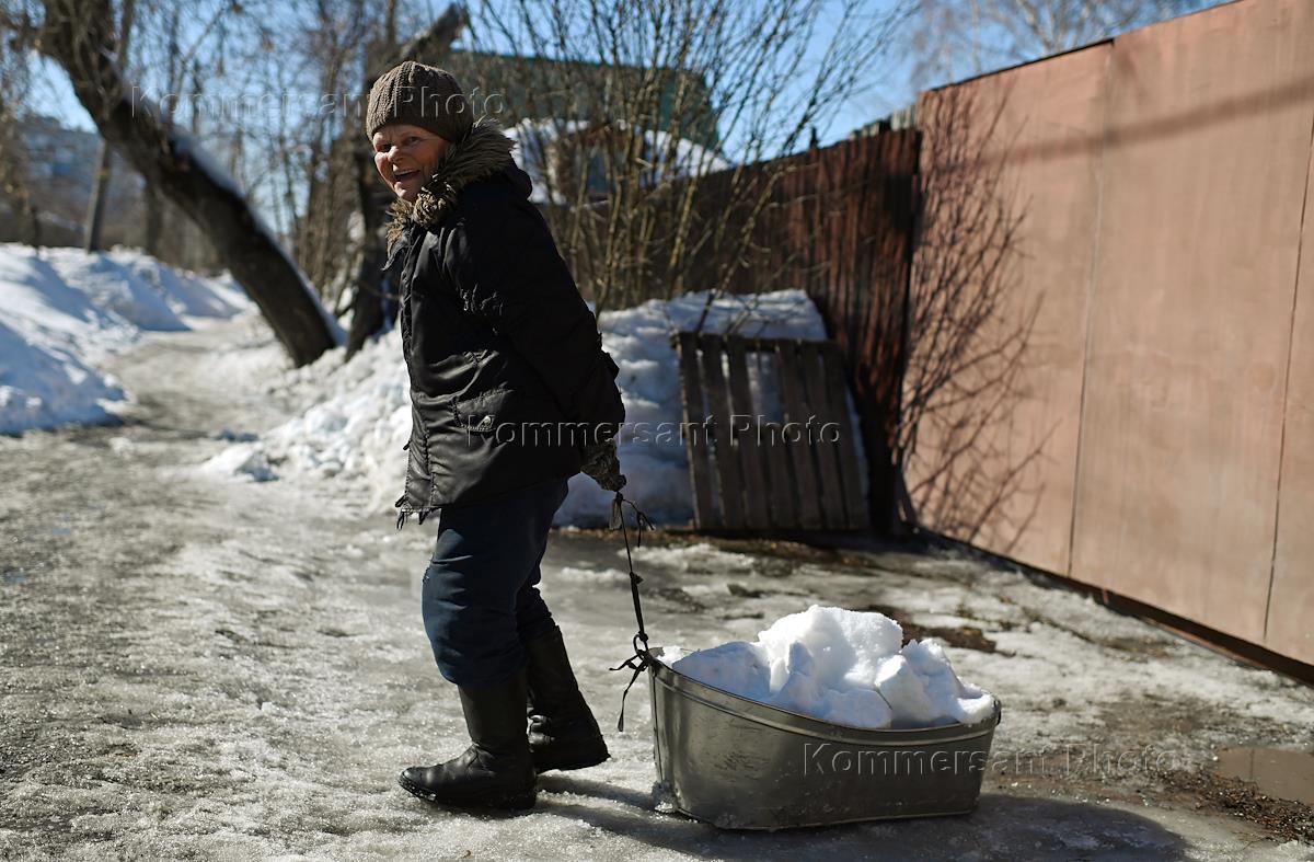 Views of Omsk. Genre photography. An elderly woman in a utility trough removes snow from her yard to the street.