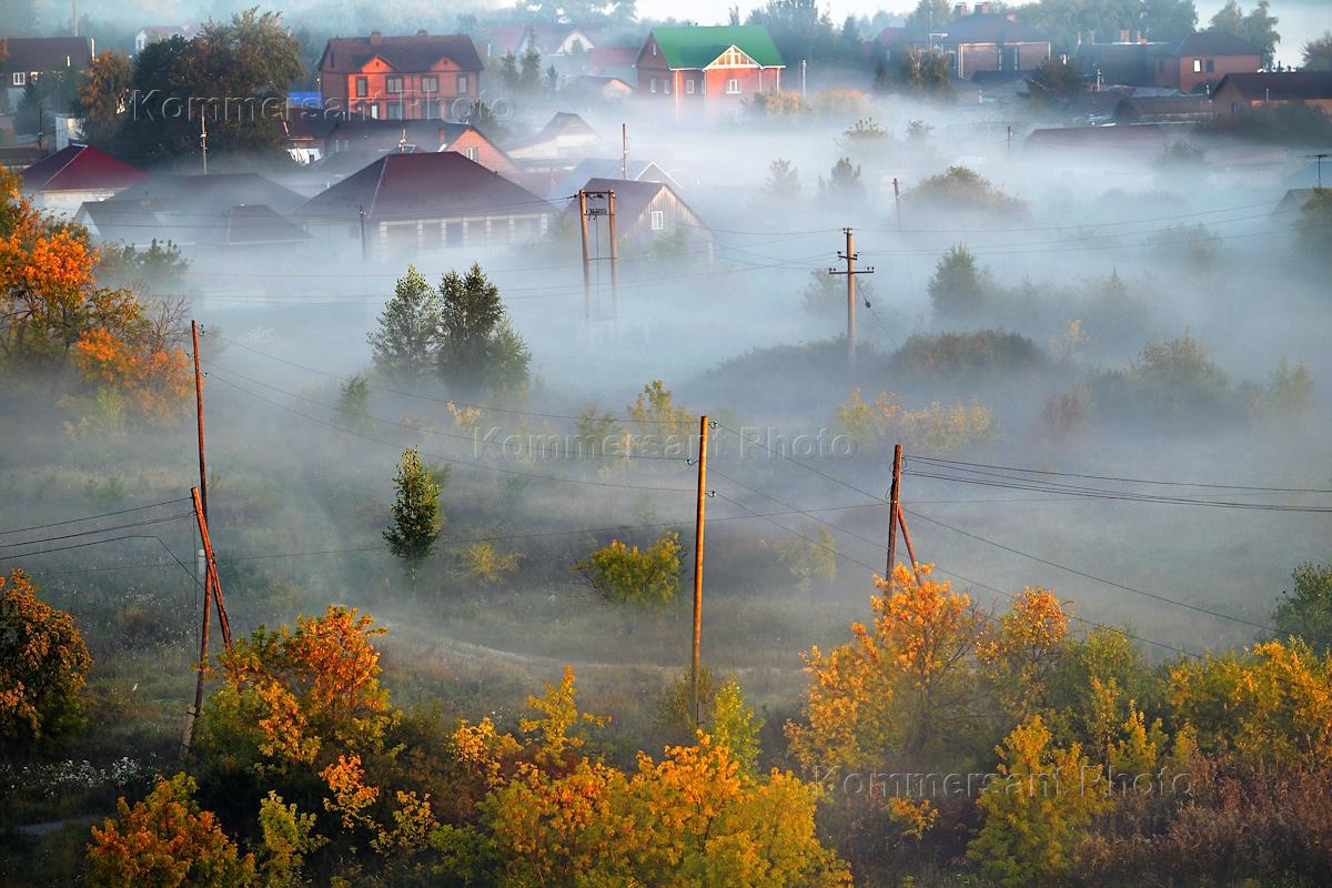 Genre photography. Fog over private houses in the city.