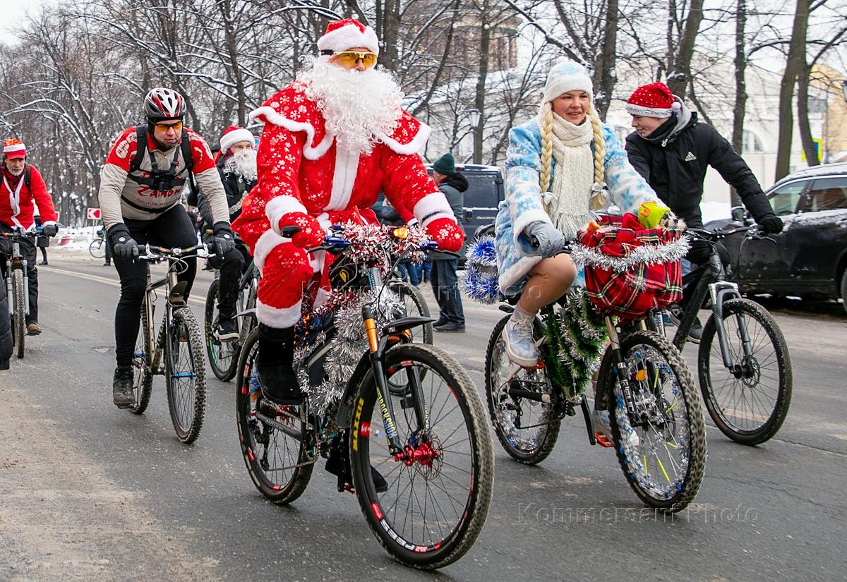 ХI велопарад Дедов Морозов и Снегурочек в Старый Новый год стартовал на Конногвардейском бульваре и финишировал на Васильевском острове. Участники во время велопарада.