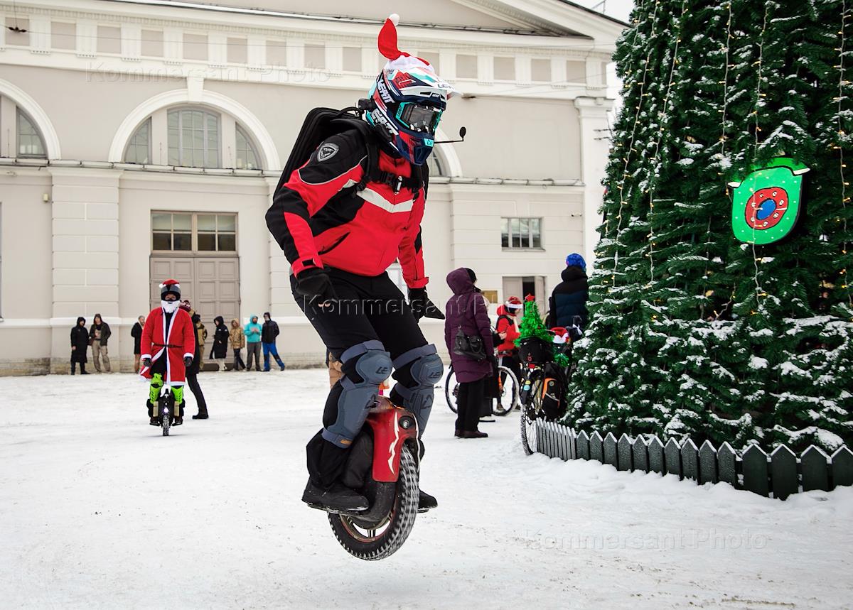 ХI велопарад Дедов Морозов и Снегурочек в Старый Новый год стартовал на Конногвардейском бульваре и финишировал на Васильевском острове. Участники на финише.