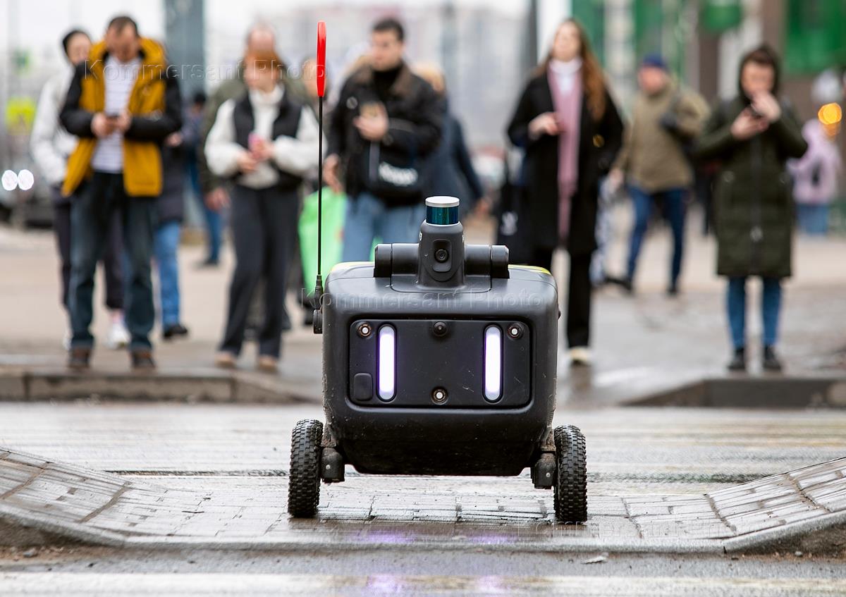Genre photography. Yandex delivery robot at a pedestrian crossing.