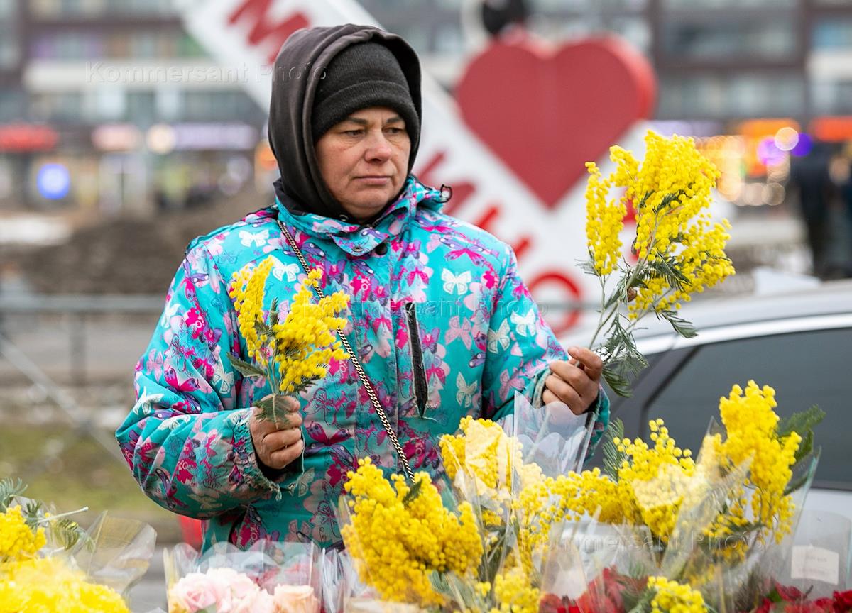 Genre photography. An elderly woman walks along Nevsky Prospekt near the window of a lingerie store.
