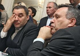 Бывший мэр Грозного Бислан Гантамиров (слева) и заместитель председателя Комитета Государственной Думы России по безопасности Виктор Илюхин (справа) во время заседания "Круглого стола" на тему: "Политический смысл "кадыровщины" и угроза распада Российской Федерации". Заседание прошло в Центральном Доме журналиста.