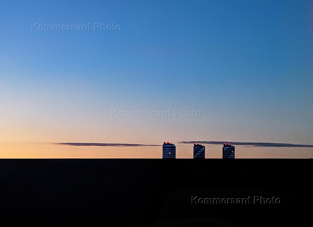 Views of Kazan. Genre photography. Multi-storey residential buildings on the horizon during sunset.