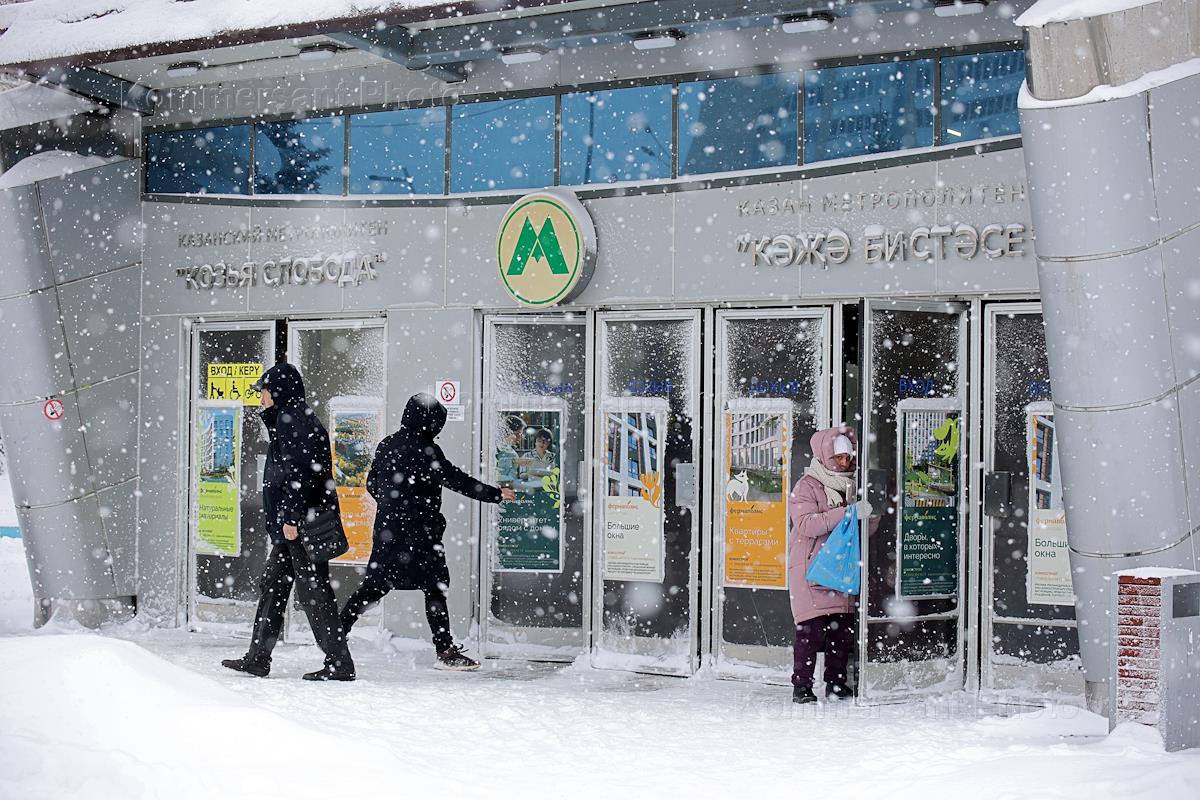 Виды Казани во время снегопада. Жанровая фотография. Пассажиры у входа на станцию метро "Козья слобода" / "Кәҗә бистәсе".