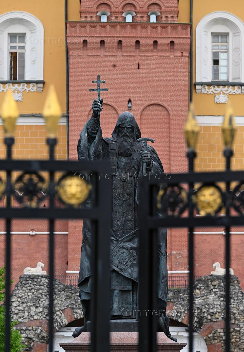 Views of Moscow. Genre photography. Monument to Patriarch Hermogenes in the Alexander Garden against the backdrop of the home church of the Martyr Tatiana at Moscow State University.