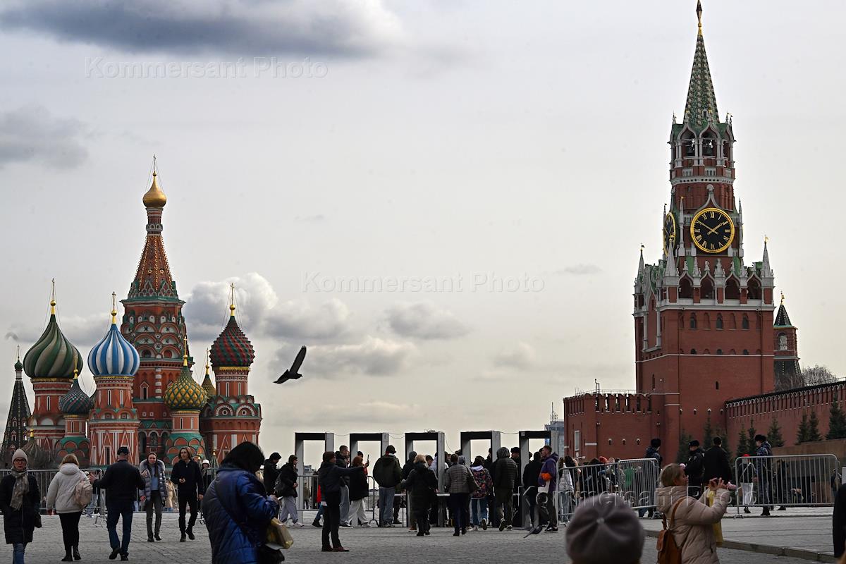 Genre photography. Red Square. Spasskaya Tower of the Kremlin. Assembling a metal structure on the square.