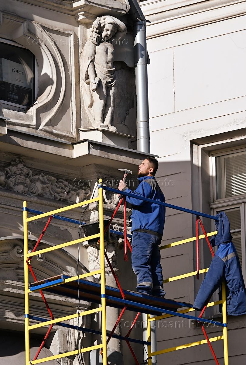 Genre photography. Construction workers on scaffolding during the restoration of the facade of a historic building in the city center.