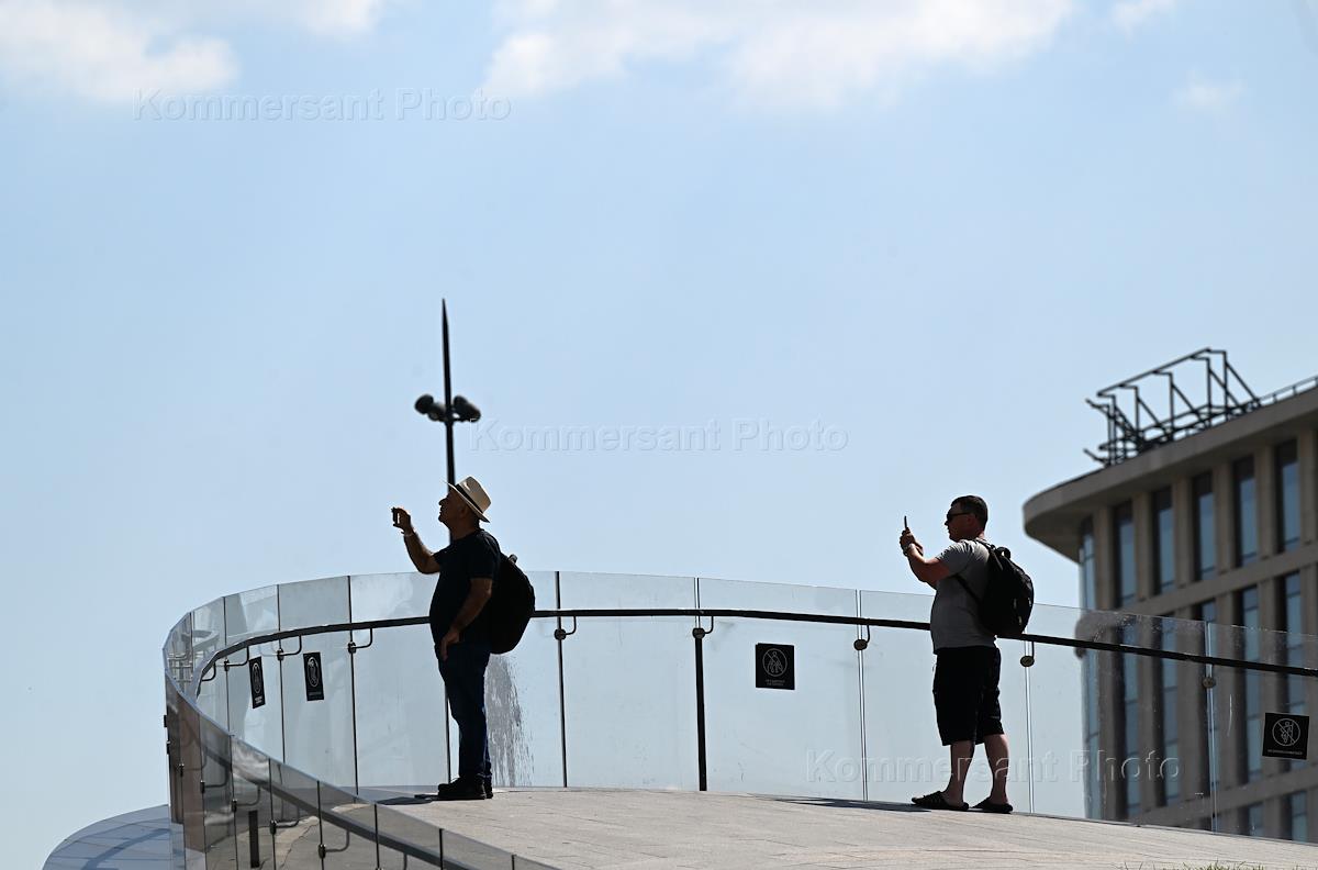 Views of Moscow. Genre photography. Tourists on the observation deck in the landscape park near Paveletsky railway station.