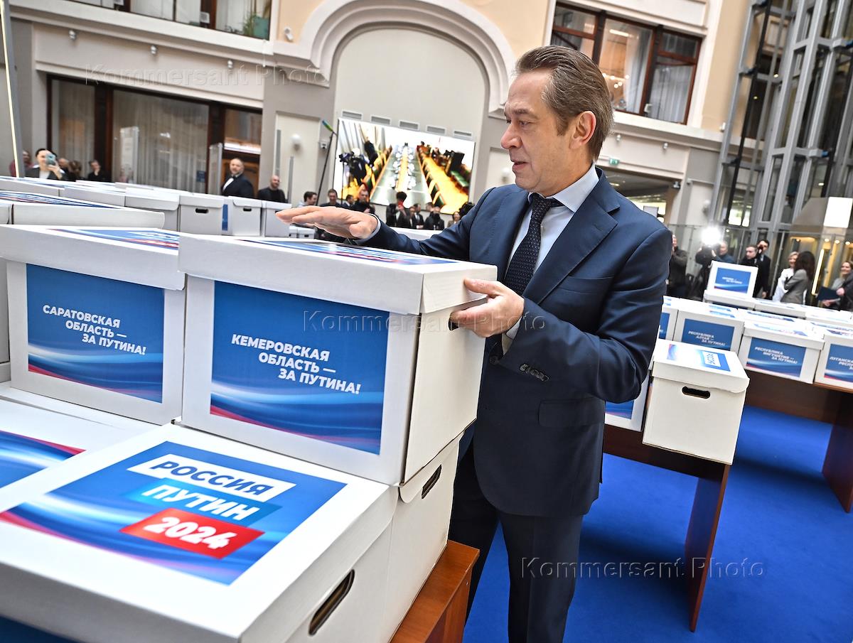 Мероприятие, посвященное сбору подписей, собранных в 89 регионах, в поддержку кандидата на должность Президента России Владимира Путина в Центральной избирательной комиссии (ЦИК) России.