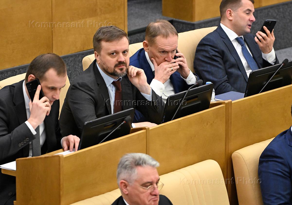Пленарное заседание Государственной думы (ГД) России. Слева направо, нижний ряд: заместитель председателя комитета ГД России по вопросам собственности, земельным и имущественным отношениям Николай Николаев, член комитета ГД России по аграрным вопросам Дмитрий Лоцманов, член комитета ГД России по делам Содружества Независимых Государств, евразийской интеграции и связям с соотечественниками Артем Кавинов и заместитель председателя комитета ГД России по развитию гражданского общества, вопросам общественных и религиозных объединений Владимир Шаманов во время заседания.