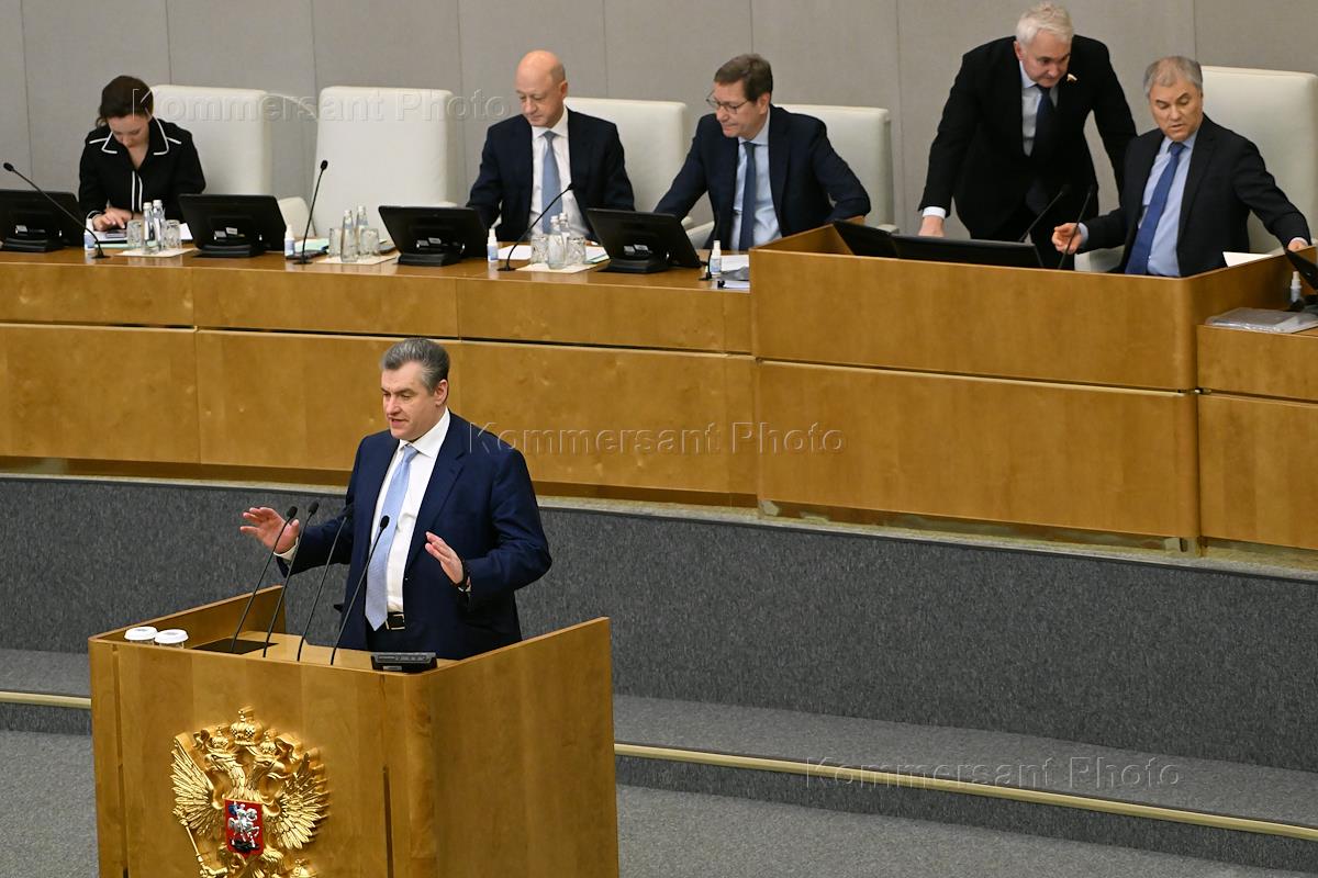 Пленарное заседание Государственной думы (ГД) России. Председатель партии Либерально-демократическая партия России (ЛДПР), руководитель фракции ЛДПР в ГД России Леонид Слуцкий (в центре) во время заседания.